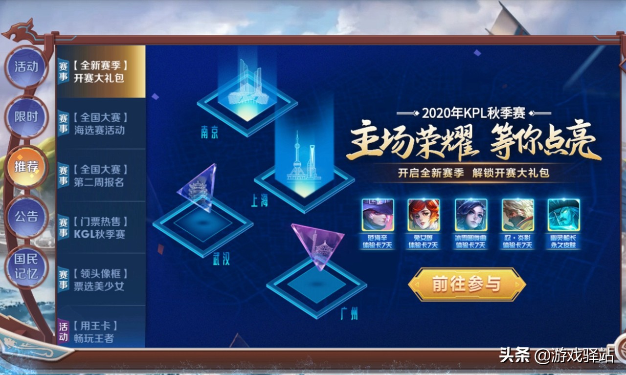 三、随着KPL新赛季的开启,官方还上线了“主场荣耀,等你点亮”活动,参与方式简单,玩家只要完成参与对局和观赛等每日指定任务,便可获得抽取城市碎片的次数,四大主场城市分别是南京、上海、武汉和广州!