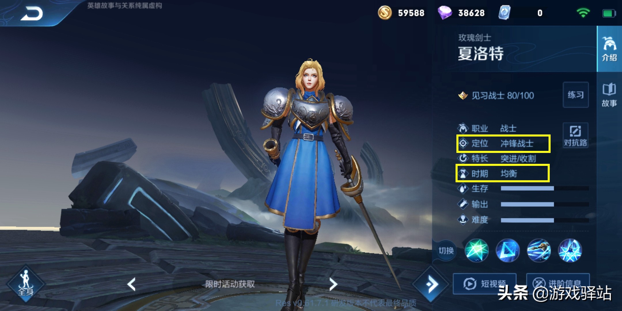 一、英雄定位更改和增加强势时期说明,这次大版本更新后全英雄的定位更加细分,比如吕布属于重装战士,新英雄夏洛特则属于冲锋战士,前者的强势期是后期,后者则是均衡!(PS:抢先服并未上线新英雄,要等正式服更新后同步上架)