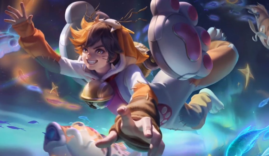 这款皮肤就是蒙犽的狂想玩偶喵,作为一名出道不算太久的英雄,蒙犽能得到新皮肤也是非常幸运啊,这款皮肤的背景是蒙犽在幻想世界中游玩,所以相关的元素都充满了童趣,比如他的两把武器就是2支巨大的锦鲤,还会一直吐泡泡呢,而蒙犽本身的装扮中又有很多猫猫元素,看上去就很萌。