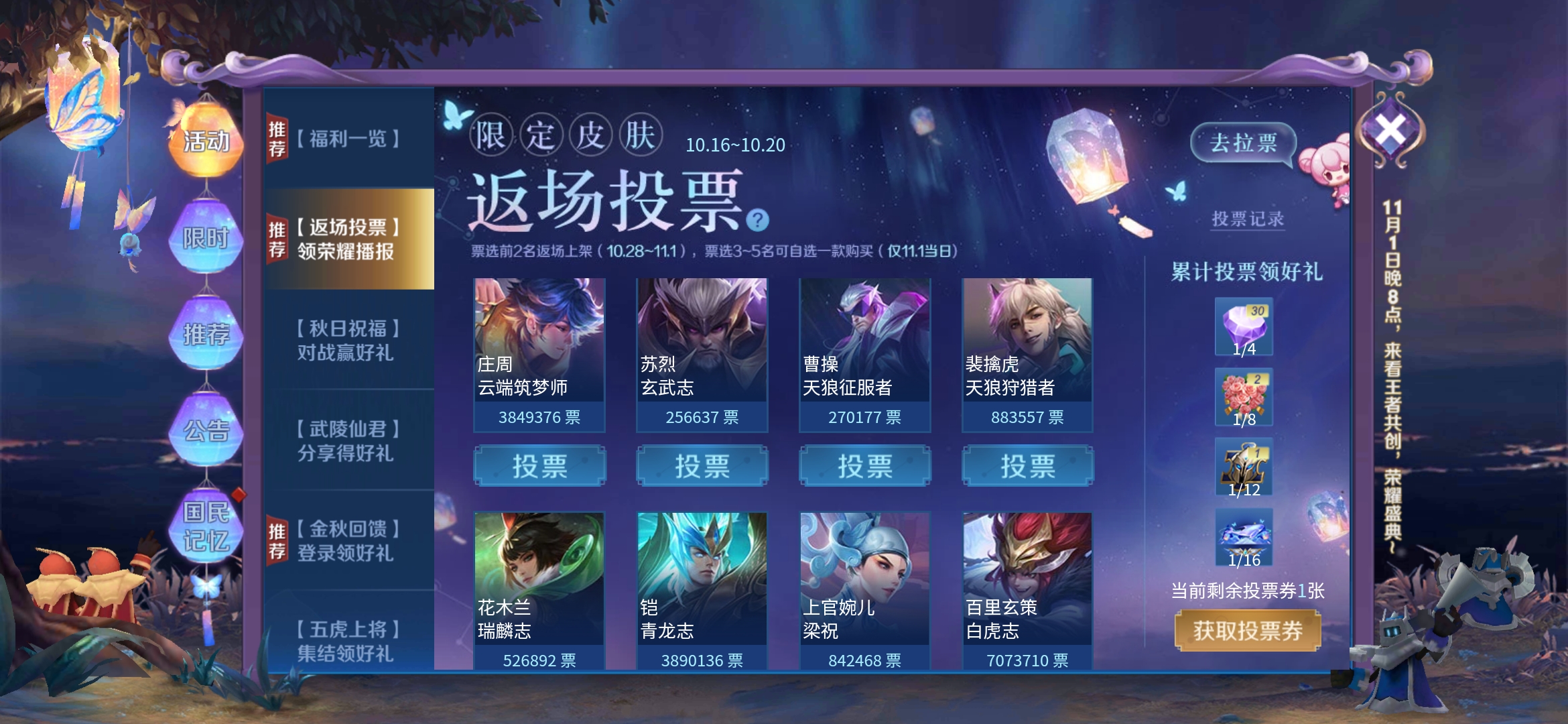 王者荣耀返场投票将在10月20日结束,也就是下个星期二结束投票,就目前的形势来看,前两名必定是白虎志和大圣娶亲,而第3~第5可能是朱雀志、青龙志、云端筑梦师,而第6的票数比第5的票数少一半,追上来的希望比较小。