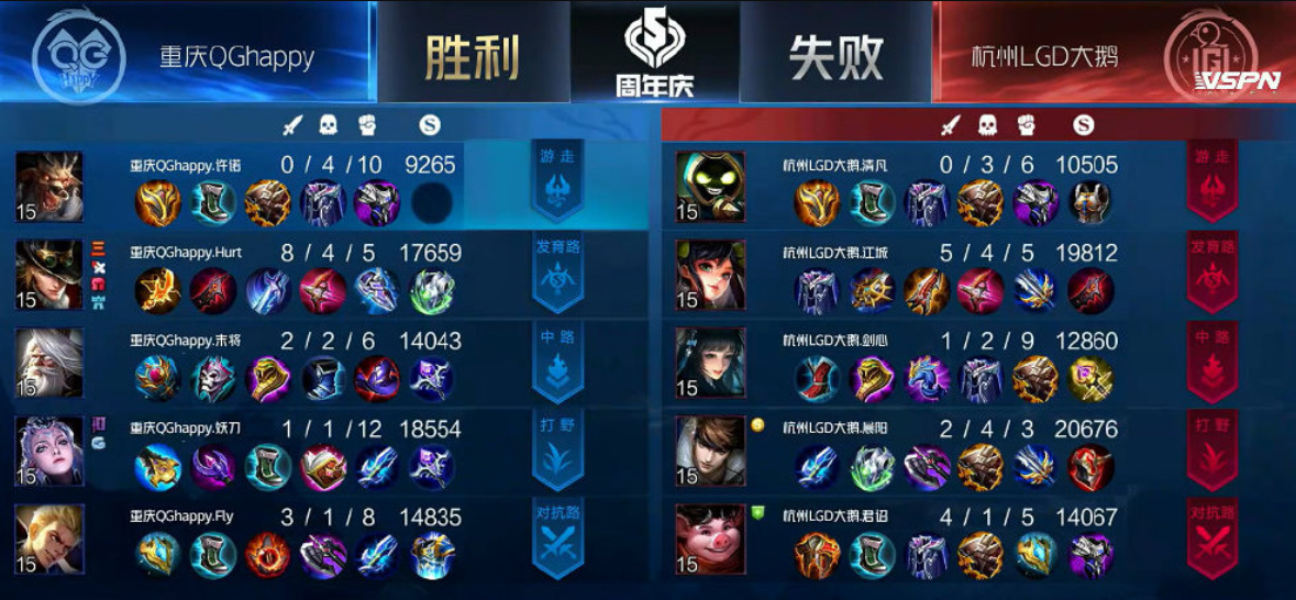 第3局,重庆QGhappy末将的上官婉儿拿到橘右京的一血,不过LGD大鹅在下路打出一波2换3给予回击,之后QG开团太急被对手反打,晨阳的老夫子拿到双杀,直接带队友打出0换4并拆掉了下路高地,优势一下子就大了起来,决胜团中,又是晨阳在扛住大量伤害的同时也打出了很高输出,LGD大鹅直接2换5团灭对手,带兵线推掉水晶获胜,2比1领先。
