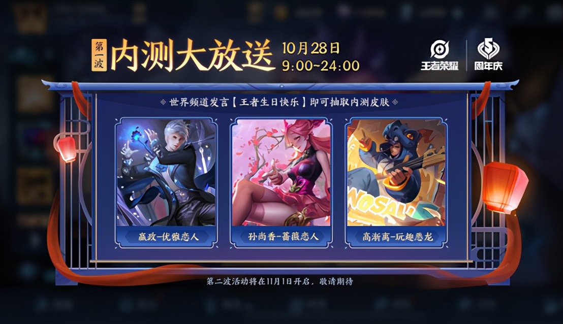 10月28日上午9点开启内测皮肤活动,在世界频道发送王者生日快乐即可抽永久内测皮肤,本次活动没有蔷薇之心,但11月1日开启的内测皮肤活动可以获得蔷薇之心。