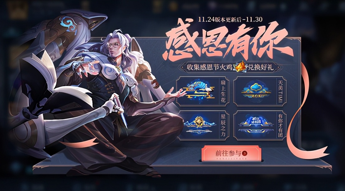 王者荣耀正式服将在11月24日上午9点开启不停机更新,本次更新的主要内容有:1、感恩节活动开启;2、头像框礼包上架;3、游戏底层优化上线;4、BUG修复,具体内容如下: