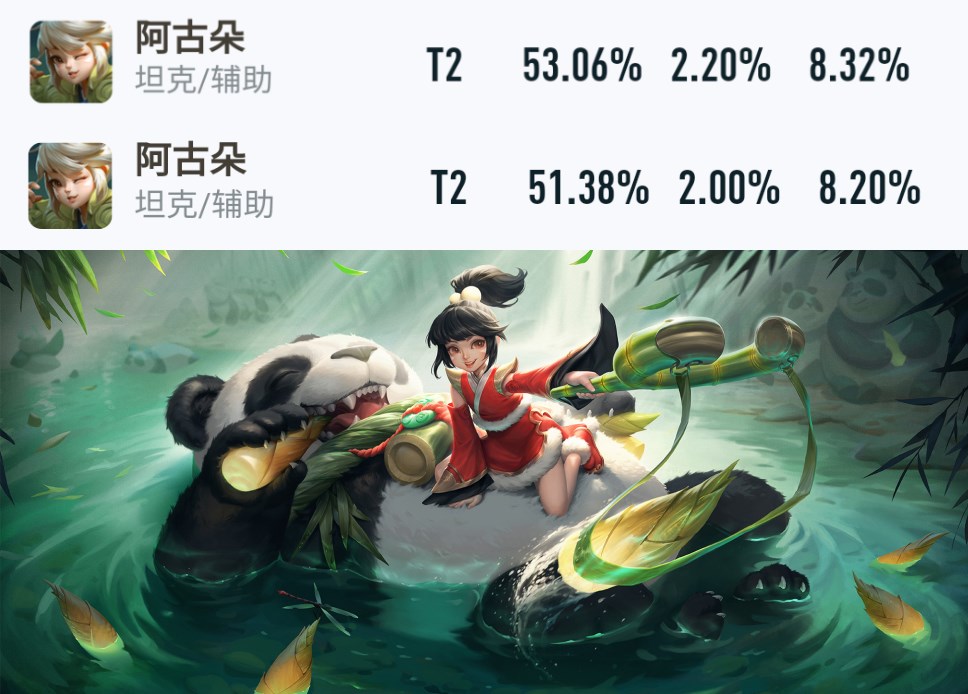 阿古朵由于削弱了召唤物的进攻性和自身的自保能力,排位胜率从53.06%下跌至51.38%,登场率仅为2%,新英雄的存在感越来越低了。(最上为更新前的数据,中间为更新后的数据)