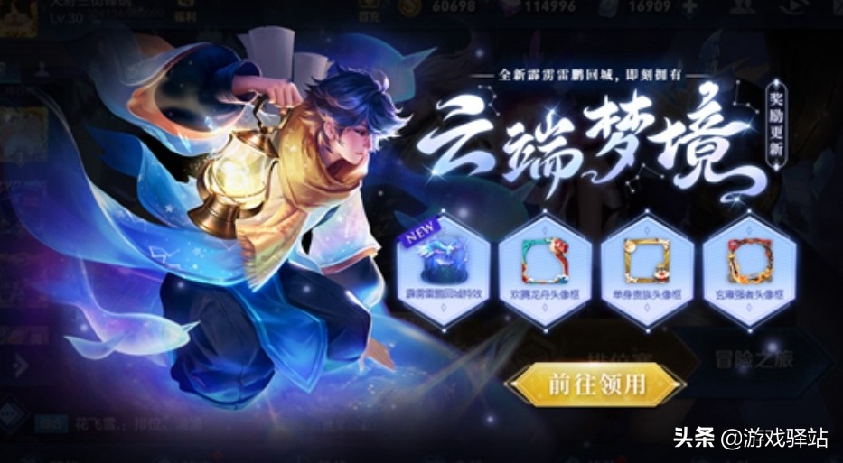 六、云端梦境奖励换新,此次更新后普通梦境除了保留三位SNK英雄供大家获取外,还新增了全新的霹雳雷鹏回城特效,以及单身贵族、欢腾龙舟和玄雍强者三款相框,玩家只要参与任务积攒星光筑梦即可获得!
