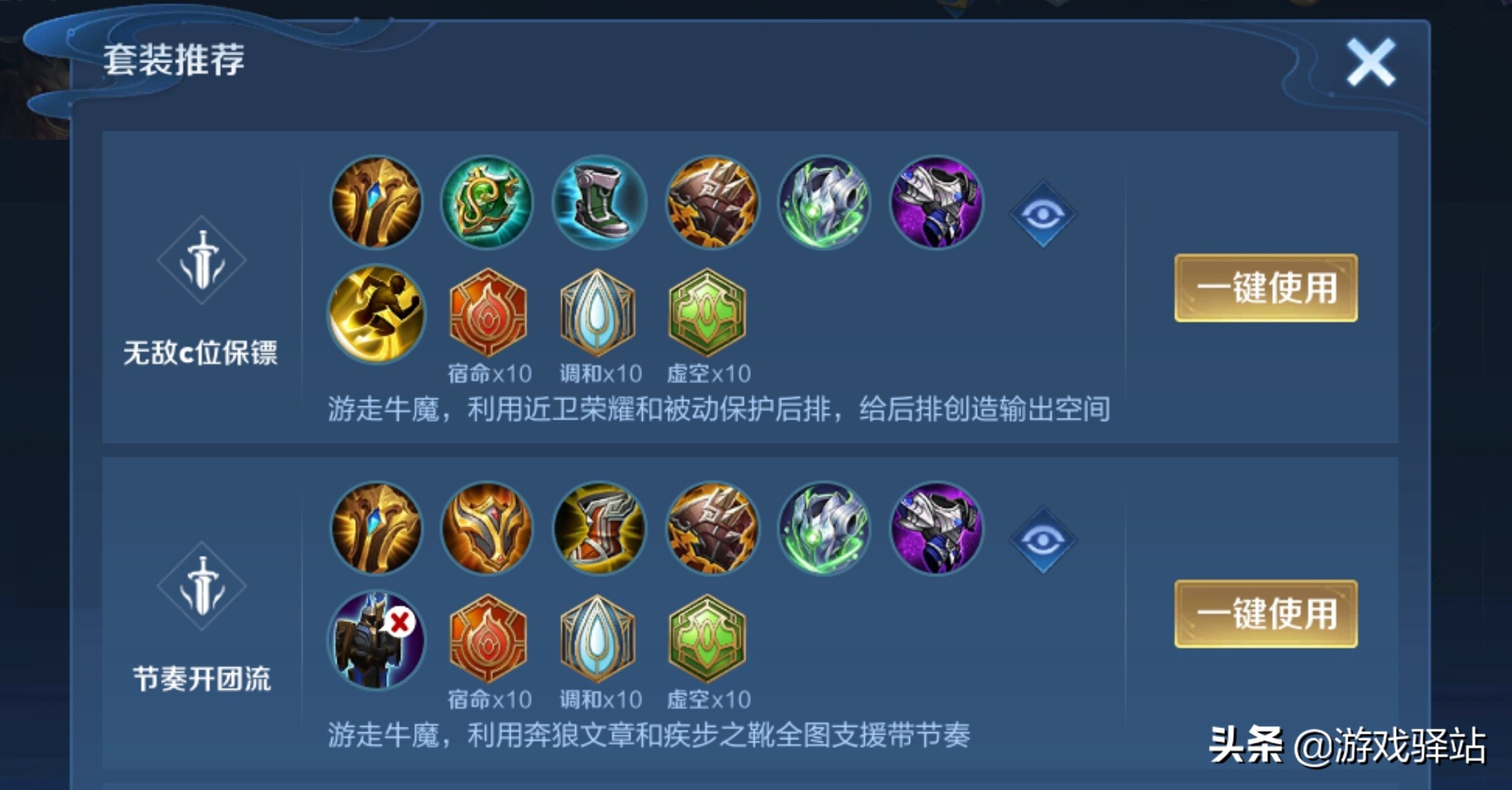 牛魔是峡谷知名的“穿墙高手”,其玩法最考验的是大闪的释放,这种基本都靠熟能生巧,所以想要用牛魔上分的玩家可以先去训练营多多练习。而出装方面,推荐两套,第一套强保后排套装,分别是近卫荣耀+救赎之翼两大保命装,搭配不详、永夜和霸者的组合;第二套是节奏开团套装,分别是近卫荣耀+奔狼纹章的提速开团组合,同样搭配不详、永夜和霸者三件套。铭文方面直接用辅坦通用的宿命、调和与虚空组合即可,可以看到牛魔的出装基本是保人为主,而实战打出控制链才是拿下团战的关键!