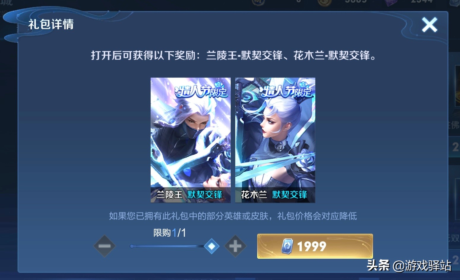 而情人节限定皮肤首次采用一传说和一史诗的配置,其中兰陵王默契交锋首周1430,而花木兰首周为710点券,原本二者需要消耗2140点券,若单一入手的话只能使用普通抵扣卡,而都入手的话,可选择两款皮肤的情侣限定礼包(1999点券),能省下141点券。