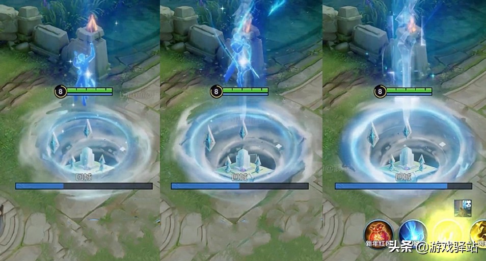 另外李白荣耀典藏皮肤的回城特效同样给力,在一个类似时空通道的漩涡中腾空而起双手合十,全身变成蓝色形态并最终幻化成宝剑回城!(图:顾钦尘)