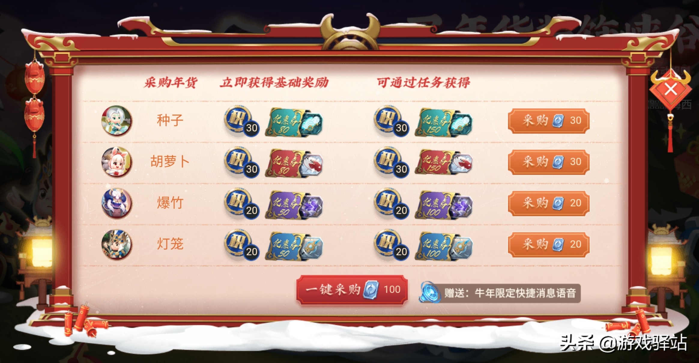 此次活动持续至10号结束,玩家帮助吕布、诸葛亮、公孙离和牛魔采购年货即可领取基础奖励,其中诸葛亮和阿离需要30点券采购,获得80点券时雨天司/祈雪灵祝专属抵扣券和30荣耀积分,而牛魔和吕布的只需要20点券采购,获得50点券奔雷神使/御风骁将专属抵扣券和20荣耀积分,拿到基础奖励后,玩家还可以做任务对抵扣券进行升级。例如小编帮助诸葛亮采购年货后,还能完成参与对局、提升英雄熟练度和击败英雄等任务获取经验,只要集齐100经验值即可对基础奖励进行升级(即便不做任务也能在10号消耗钻石兑换经验值),诸葛亮的80抵扣券变成150抵扣券,算上采购的30点券,等于是入手皮肤能省下120点券,即合计消耗1430-120=1310点券得到时雨天司,其它皮肤同理!