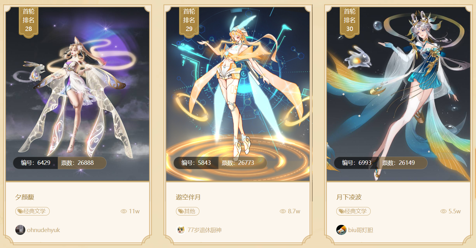 以上这三十个作品将参加下一轮官方评选,其中有部分作品存在拉票的情况,所以才出现质量参差不一的情况。就小白狐个人看法,排名第1、第2、第14、第19、第27、第28等都是很不错的作品,而最佳创意奖可能会在第一和第二之间产生。其次,嫦娥的源梦皮肤预计将在12月份上线,售价60点券,品质为史诗限定。