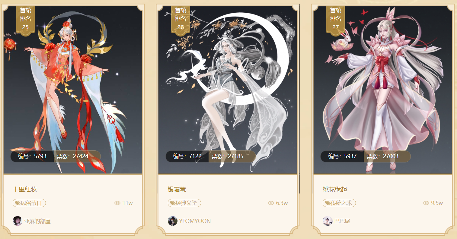 排名10~12的作品:分别带有刺绣、青鸾、龙女的元素。