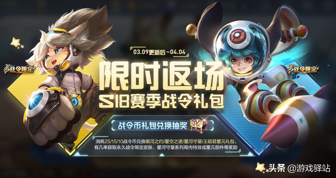 一、S18赛季战令礼包限时返场,包含了战令限定皮肤李元芳银河之约、沈梦溪星空之诺、王昭君星元套装、星河守望击败特效/回城特效/荣耀播报/头像框,四种礼包每次兑换需要消耗25/15/10/10战令币,且本赛季达到指定战令等级,虽说是概率抽取,但只要累计开满礼包次数就能必得战令限定皮肤和星元套装。