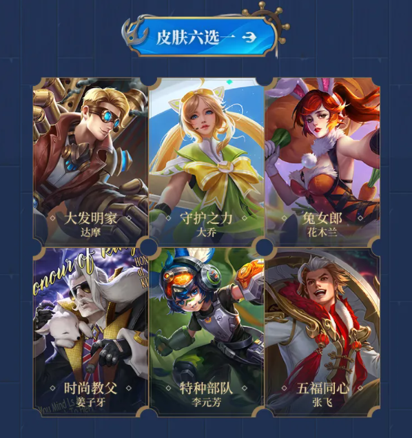 6款皮肤免费得其一:守护之力、五福同心、兔女郎、时尚教父、特种部队、大发明家,在免费皮肤选择上,一般都遵守同一个原则:只选贵的,不选对的。很显然,只有达摩的大发明家是888点券皮肤,所以就建议优先选择大发明家,而且这款皮肤是不可多得的潜力股,很可能会翻新升级为史诗品质。