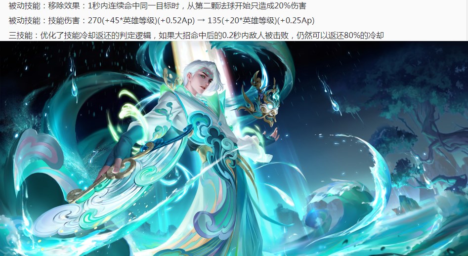 诸葛亮削弱:被动伤害降低一半,移除被动的伤害衰减机制,大招触发的装备伤害击杀目标也可以返还CD。即爆发伤害降低,后续伤害增高,总伤变化不大。
