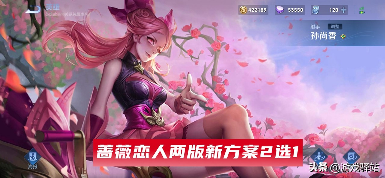 这次针对蔷薇恋人的优化涉及了海报、模型、局外展示动作/场景和局内技能特效,使其更符合史诗定位。而最初公布的是两款设计稿供玩家票选决出胜者,然后依据得票数高的设计稿制作原画和模型,全新两版方案如下所示: