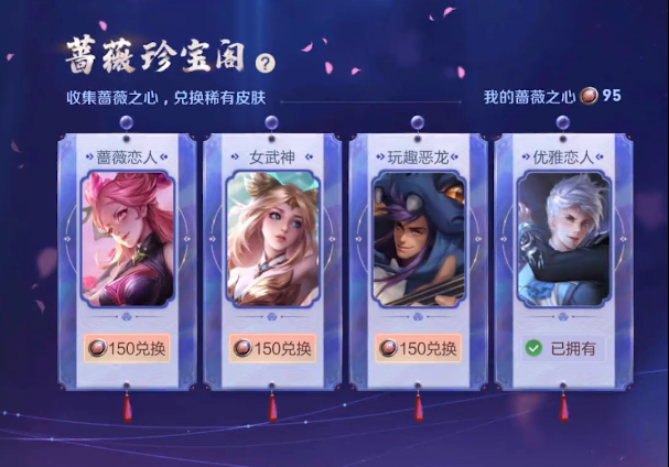 珍宝阁与蔷薇之心活动一同开启,本次新上架了高渐离的玩趣恶龙,这也是兑换商店改版以来首次上架该皮肤,另外还有蔷薇恋人、优雅恋人、女武神可兑换,需要消耗150蔷薇之心才能获得永久。