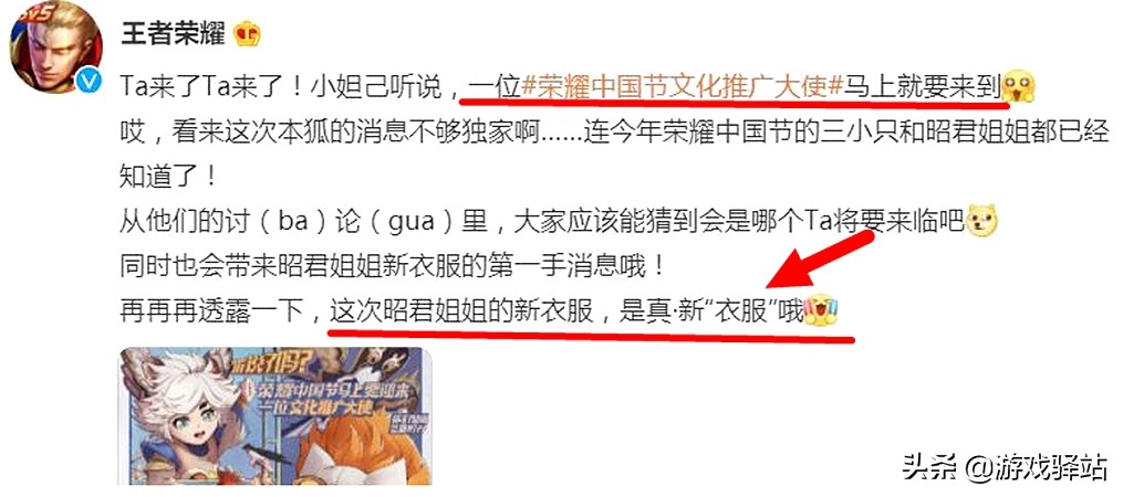 首先官方透露的消息有两个,其一是王者峡谷将迎来首位“荣耀中国节大使”,其二是王昭君的新衣服是真·新“衣服”。通过海报中的英雄描述可以获知,929出生、歌声超级仙以及曾经来过王者峡谷的“大使”,已经锁定周深;而关于真新衣服的描述,目前玩家的推测有以下两个: