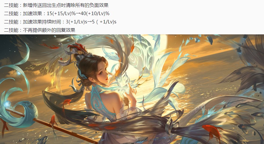大乔削弱:移除2技能送回城后的回血效果,2技能送回城后的移速增高且加速更久。