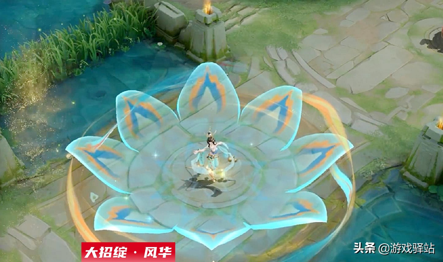 大招绽·风华,貂蝉的法阵变成了黄沙环绕的巨型青色莲花,莲花的赤青蓝色同样来自壁画,持续期间还会出现花朵飘飞的效果。