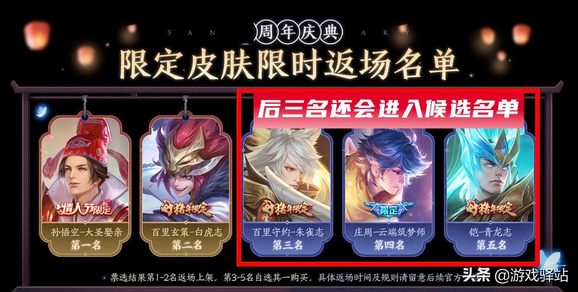 首先进入候选名单的规则不变的话,排除掉已经返场过,以及2021年推出的新限定皮肤,今年将有多达27款限定皮肤进入候选池,其中包含了去年排第三到第五的3款皮肤——百里守约朱雀志、庄周云端筑梦师和铠青龙志。因为返场名额一样,今年同样有5款限定回归,其中票数前二的直接上架,而后三位则以自选宝箱的形式让玩家3选1。