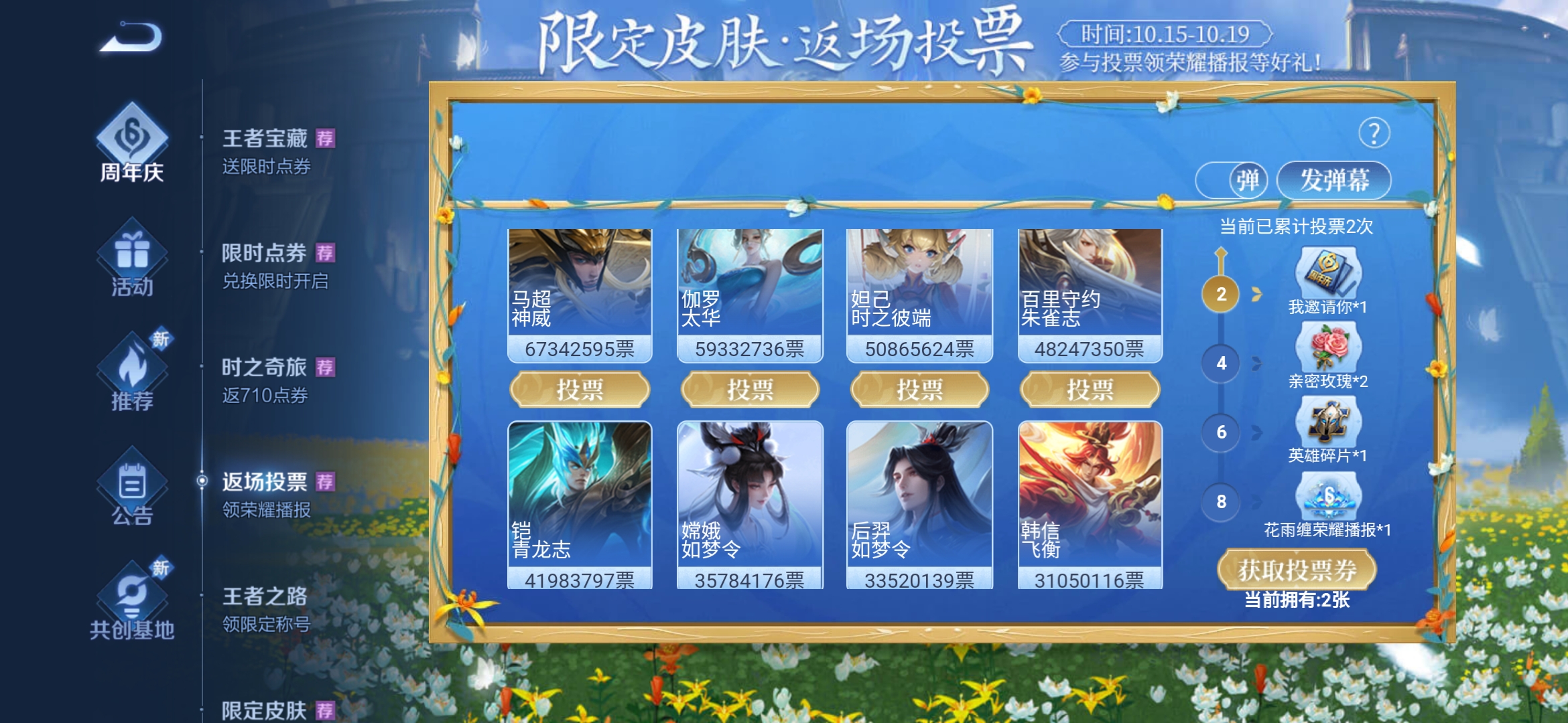 此外,返场投票活动于昨晚正式结束,票数前五的限定皮肤将在本月底限时返场,其最终总票数为马超神威6734W票、伽罗太华5933W票、时之彼端5086W票、朱雀志4824W票、青龙志4198W票。其中马超神威(888点券)和伽罗太华(1788点券)将在10月28日限时上架,时之彼端(888点券)、朱雀志(888点券)、青龙志(888点券)将在10月30日限时上架,玩家只能从中三选一入手。