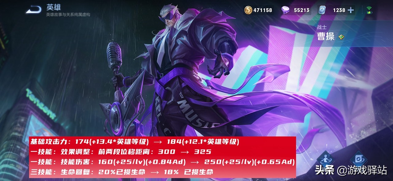 而加强的英雄有曹老板,官方增加了比赛前期1技能伤害和基础攻击力,作为平衡削弱了后期的数值,同时还略微削减了大招回血能力,弥补方式是1技能前两段突进距离提升,此次调整解决了曹操前期伤害不足和近身乏力的问题。
