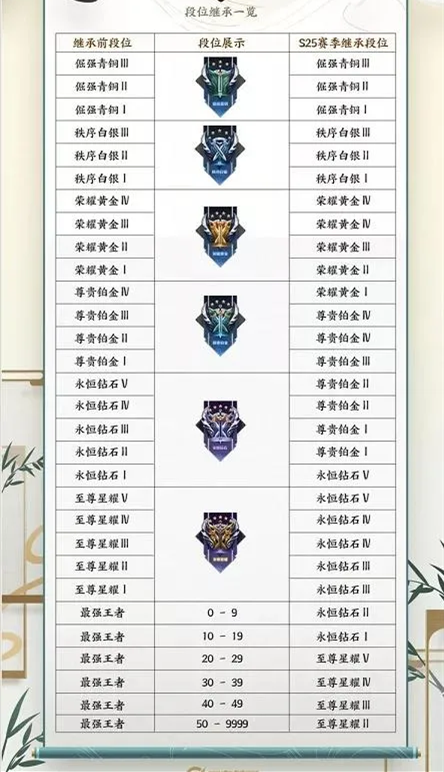 由于新增了两个段位,所以在S27赛季开启之时,段位继承规则将有小改动,而当前赛季的继承规则和原来一样,如下图: