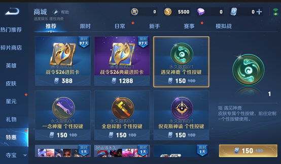 首期推出倪克斯神谕、全息碎影、一念神魔、遇见神鹿这四款皮肤的个性按键,将以188点券上架,首周折扣150点券。
