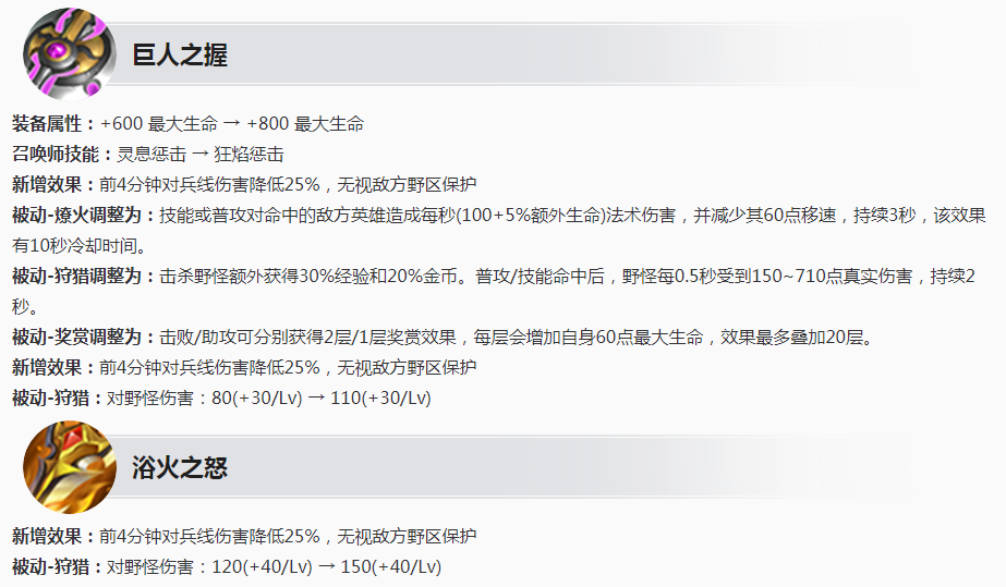 巨人之握调整:升级路线改为黄刀起步,被动灼烧改为普攻附带持续伤害,惩击改为黄刀加速惩击。