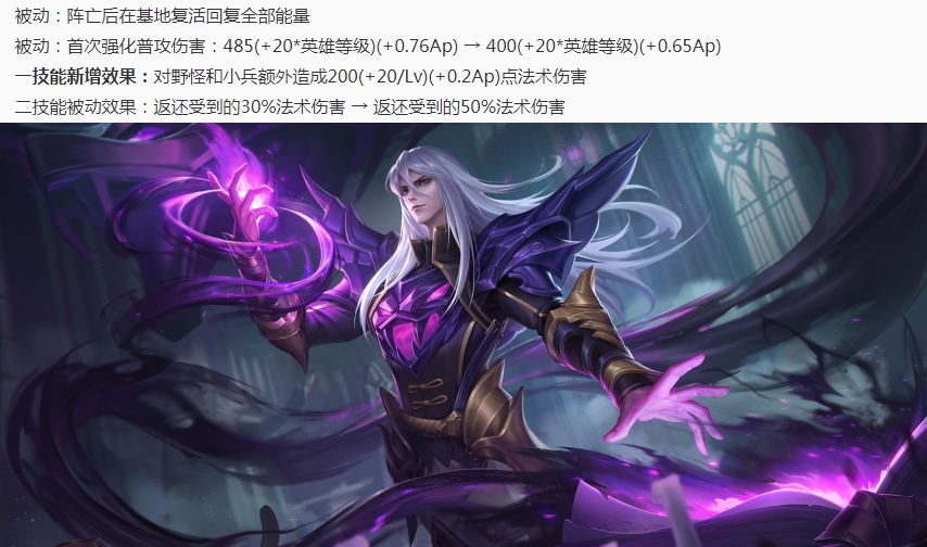 司马懿调整:被动伤害降低,复活时满能量,1技能新增对野怪小兵的额外伤害,对抗法师时的生存增高。